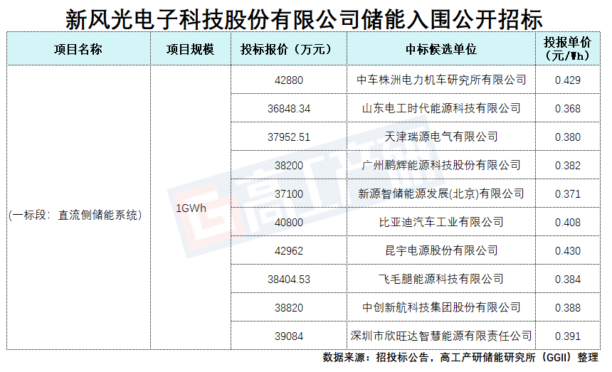 3月储能系统中标市场最值得关注的,本月储能系统报价再创新低,进入“0.3元时代”。新风光电子科技股份有限公司1GWh直流侧采购开标,中车株洲所、山东电工时代、瑞源电气、鹏辉能源等10家入围,投标报价范围为0.368~0.430元/Wh。