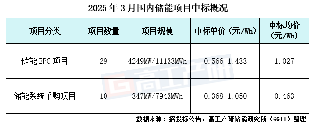3月中标项目包括29个储能EPC项目,10个储能系统采购项目。价格方面,储能EPC项目的中标单价区间在0.566元/Wh到1.433元/Wh之间,均价为1.027元/Wh;储能系统采购的中标单价区间在0.368元/Wh到1.050元/Wh之间,均价为0.463元/Wh,较上月下降21%。中标最低价来自新风光电子科技股份有限公司直流侧储能系统采购项目,山东电工时代能源科技有限公司报价0.368元/Wh。