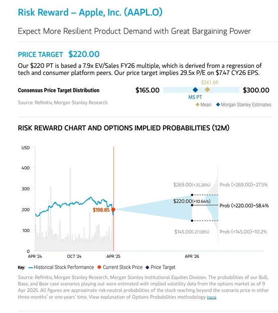 据了解,继4月8日摩根士丹利(以下简称“大摩”)因特朗普政府宣布面向全球的激进关税政策重创苹果基本面预期,该机构将苹果12个月内目标价从 252美元大幅下调至220美元之后,在这份最新发布的研报中大摩重申对于苹果股票的“增持”评级以及220美元目标股价,牛市情形下的目标价则高达269美元。不过,股票市场长期熊市下大摩给出的苹果悲观目标价为145美元。截至周四美股收盘,苹果股价收于190.420美元。