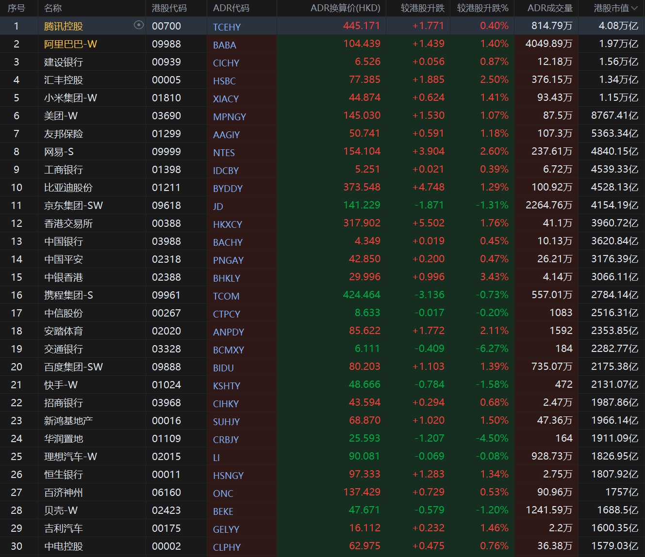 智通财经APP获悉,周五美股三大股指齐涨,恒生指数ADR上涨,按比例计算,收报21094.82点,较香港收市上涨180.13点或0.86%。