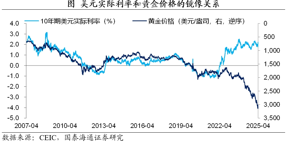 黄金价格上涨,本质上就是在证明:美元信用在下降。我们在《全球货币变局》系列专题三中就介绍过黄金的新定价模型。黄金是不生息的资产,实际利率为零,所以之前美元实际利率提高时,大家持有美元资产的意愿就会上升,黄金价格就会承压。而美元实际利率下降时,投资者持有美元资产的意愿就会下降,黄金价格就会上涨。美元实际利率和黄金之间,也是一种明显的镜像关系。而2022年以来,美国的经济增速没有特别明显的抬升,而美元的实际利率却回升到了2009年以来的最高位。在美元实际利率这么高的情况下,大家仍是愿意持有一个实际利率为零的黄金资产,这本身就说明了美元的信用在下降。这就相当于已经出现过违约事件的企业,如果要再借钱,就需要支付更高的利率,相当于信用利差在明显走阔。