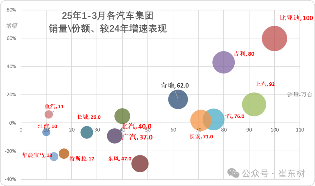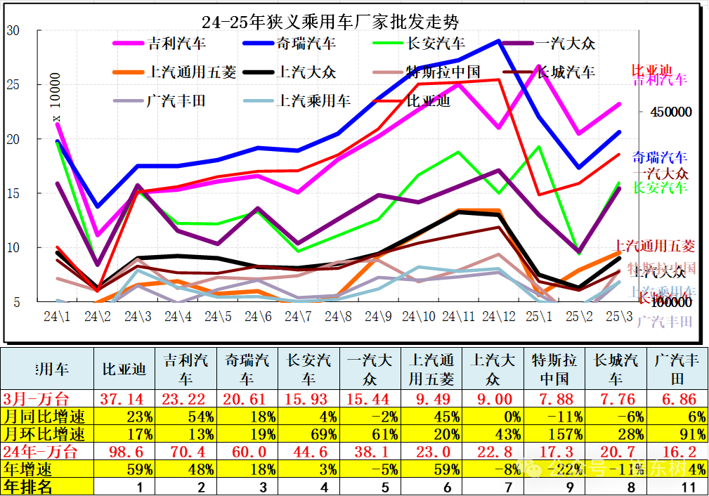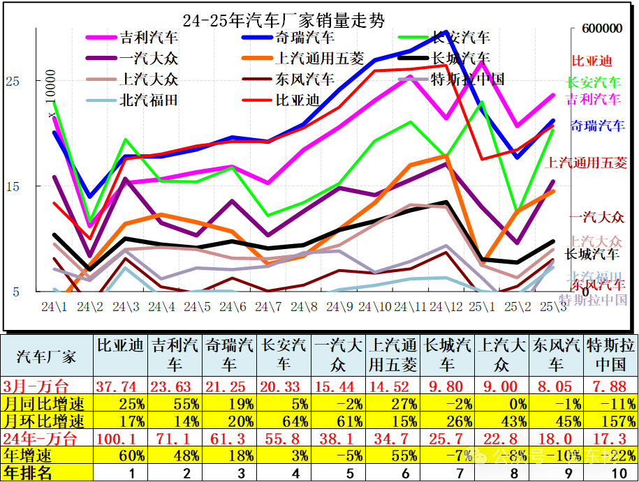 汽车市场的厂家格局巨变,行业呈现增速剧烈的分化,2025年开始的民营企业替代国企成为行业主力,吉利、比亚迪、奇瑞增速保持较高水平,这种现象目前有可持续的趋势。