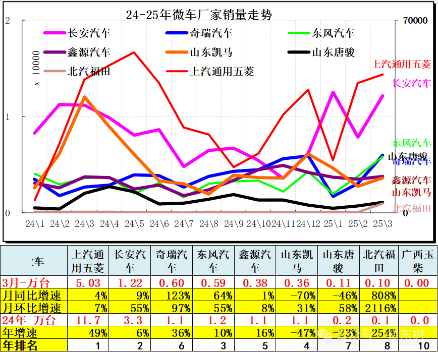2024年上半年五菱走势相对很强,随后2024年下半年调整。2025年3月大部分头部厂家销量增长。2025年五菱和东风的商用车走势较好,而新能源的微客类恢复增长,1季度的奇瑞和东风的微客类车型较强。