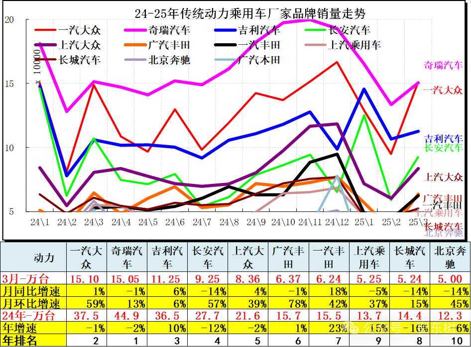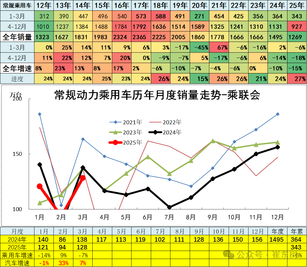 2023年传统燃油狭义乘用车销量1666万台,较2022年同期基本持平;2024年传统狭义乘用车销量1495万台,较去年同期同比下降10%;2025年1-3月销量343万台,同比下降6%,3月下降7%。