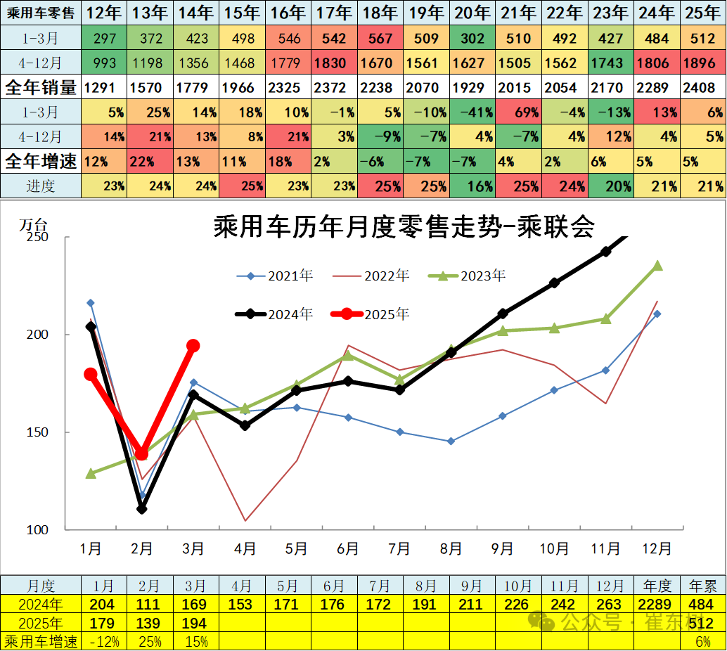 智通财经APP获悉,4月12日,崔东树发布2025年3月汽车细分市场走势和厂家竞争表现分析。3月全国汽车市场走势分化,呈现乘强商弱的走势。2025年1月底新一轮补贴政策落实,狭义乘用车2-3月零售最终高于此前预期。两新政策发布前,市场热度较低,1月消费者多处于一种观望与等待的状态,2-3月市场热度快速增长,消费类乘用车产品在春节前的消费保持较好态势,而商用车市场出现结构性增长特征。去年的商用车渠道库存偏高,今年3月的商用车走势分化,轻卡、微客和大中客的新能源类别增长较强。