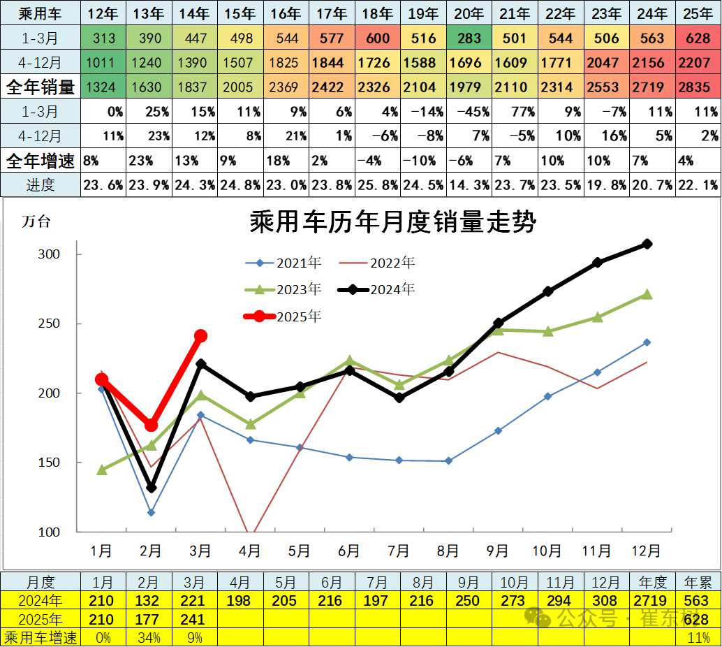 2025年3月累计狭乘合计销量627.6万台,累计增速11%;3月份狭乘合计销量241.2万台,同比增长9%,环比上月增长36.5%。近几年新能源车技术创新、新品竞争力不断增长,燃油车新品推出乏力。2025年春节后的新能源车快速增长,2月带来45万台增量,3月增量20万台,新能源车带来车市的较强发展。