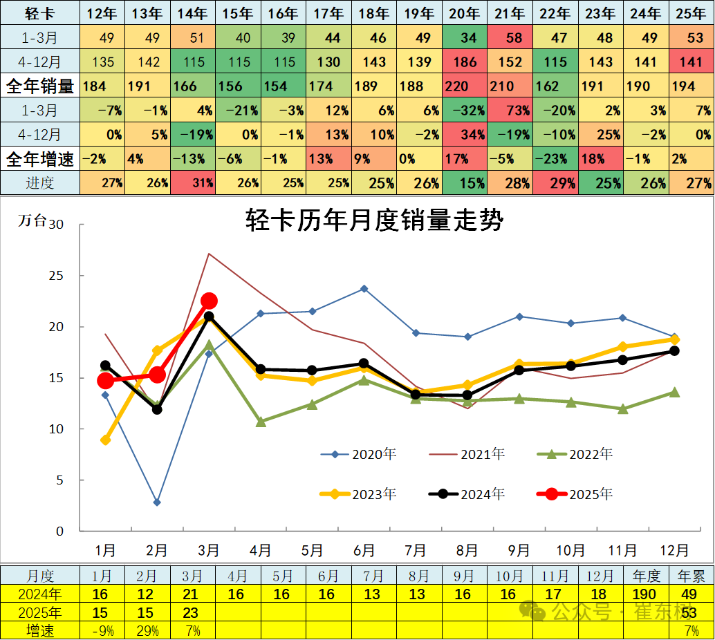2023年全年累计厂家销量卡车合计销量292.73万台,累计增速22.8%;2024年累计轻卡销量189.9万台,累计下降0.5%;2025年3月累计轻卡销量52.6万台,累计增速7%;3月份轻卡销量22.5万台,同比增长7.4%,环比上月增长47.2%。