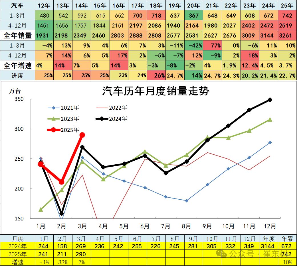 2025年3月累计汽车总计销量741.8万台,累计增速10%;3月份汽车总计销量289.6万台,同比增长7%,环比上月增长37%。今年3月乘用车销量走势较强,3月回升较大的走势,政策补贴驱动增长了消费信心。