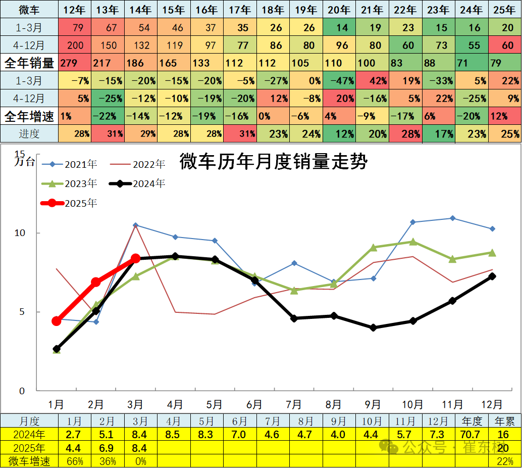 2023年全年累计厂家销量微车合计销量88.24万台,累计增速6.3%;2024年累计微车合计销量70.7万台,累计下降19.8%;2025年3月累计微车合计销量19.7万台,累计增速22.2%;3月份微车合计销量8.4万台,同比下降0.1%,环比上月增长21.6%。