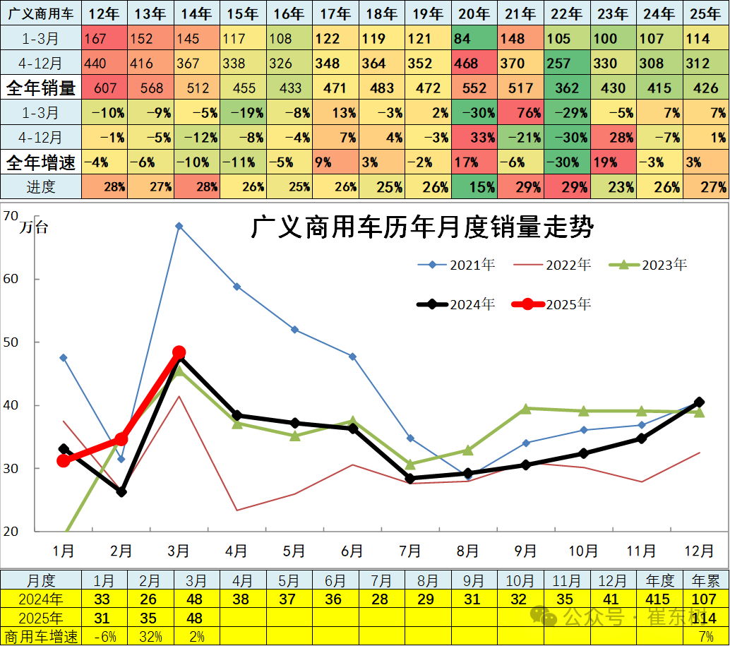 2023年全年累计厂家销量广义商用车销量429.77万台,累计增速18.6%;2024年累计广义商用车销量414.8万台,累计下降3%;2025年3月累计广义商用车销量114.2万台,累计增速6.6%;3月份广义商用车销量48.4万台,同比增长1.6%,环比上月增长39.8%。2025年开局主要是2月市场恢复较强。