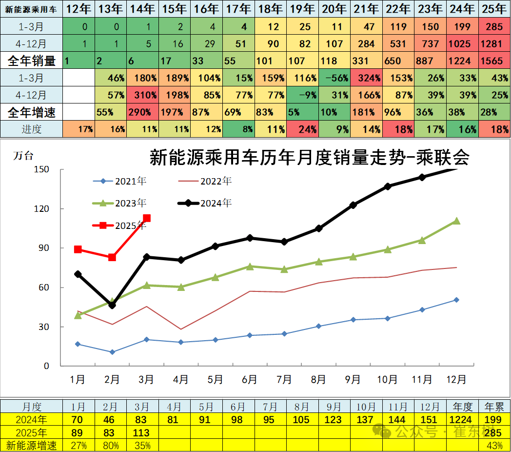 2025年1-3月新能源乘用车批发狭乘合计零售销量285万台,同比增43%。