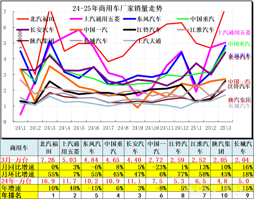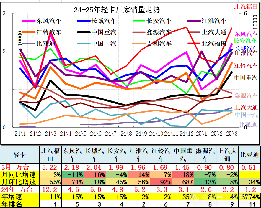 2025年的轻卡主力厂家分化较明显,重汽汽车等同比去年3月暴增,东风的3月环比回落。