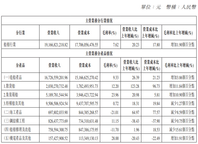 智通财经APP了解到,中船防务经营业务包括造船产品、海工产品、钢结构工程、船舶修理及改造以及机电产品,2024年两大核心产品造船及海工均保持高增长水平,收入分别为167.27亿元及6.98亿元,同比分别增长26.4%及64.97%,收入合计贡献90.91% ,同比增长5.24个百分点。不过其他部分产品收入有所下滑,期间钢结构及机电产品收入分别下滑38.43%及20.43%,但收入合计贡献仅为5.13%。