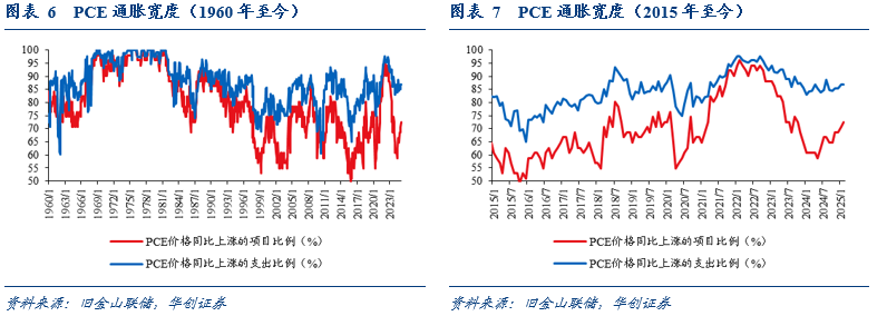 2024年下半年以来,PCE价格同比上涨的项目比例从62.7%升至72.5%,2015-2019年的中枢为63.6%,2021年下半年-2022年的均值为91.1%;PCE价格同比上涨的支出比例从84%回升至87%,2015-2019年的中枢为80.6%,2021年下半年-2022年的均值为94.7%。