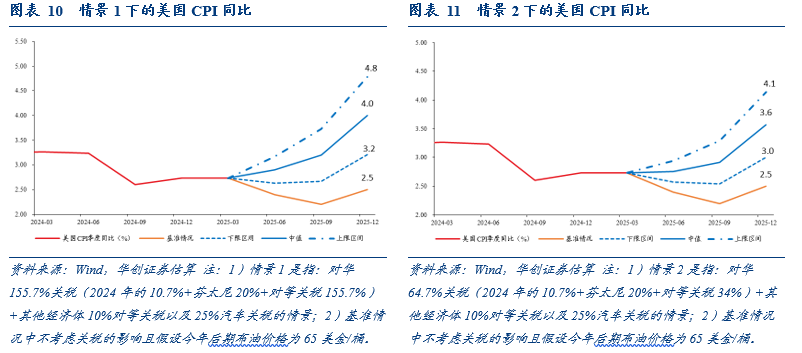 情景1:考虑对华155.7%关税(2024年的10.7%+芬太尼20%+对等关税125%)+其他经济体10%对等关税以及25%汽车关税的情景(截至4月11日的情况):对应的美国整体进口关税税率提升约23.5个百分点,影响短期通胀上行幅度约0.9~3.1个百分点,假设关税的影响逐季体现且在1年内达到累计峰值,取影响区间的中值和最大值,对应今年四季度CPI同比可能分别升至4.0%和4.8%。