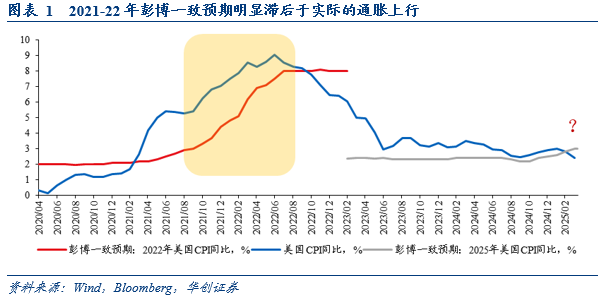 专业人士的通胀预期可能相对滞后。从2021-22年的经验来看,彭博一致预期的通胀预测是在“追着实际通胀跑”,通胀预测明显滞后于实际的通胀上行。以本轮为例,从今年2月份开始,今年美国CPI同比的彭博一致预期才从2.6%逐步上调至目前的3%。3%这一幅度大概率也还不能完全体现关税的短期价格影响。