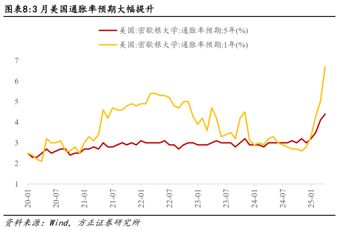 从通胀视角看,关税带来的潜在通胀问题持续成为市场担忧。参照耶鲁大学的测算,在纳入2025年所有关税后,美国的平均有效关税税率将达到22.5%,是自1909年以来的最高水平,推动2025年美国PCE上涨2.3%。从3月通胀数据看,低于预期主要源于油价和机票降价推动,且尚未反映加关税的持续影响,4-5月数据相对关键。从通胀预期视角看,4月份密西根大学的1年期通胀预期上升至6.7%,创1982年以来的最高水平。高通胀压力一方面对美联储降息带来掣肘,另一方面对美债利率带来压力。