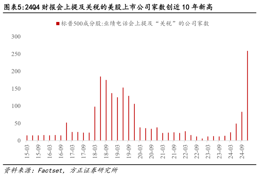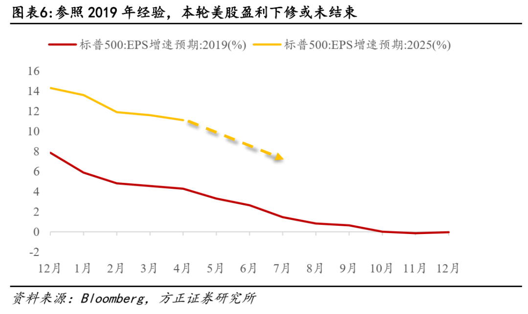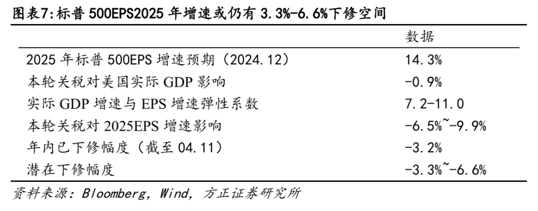 美股盈利增速预期持续下修,但大概率尚未结束。美股上市公司层面,关税风险已被广泛认知,财报电话会上提及“关税”的公司家数创近10年新高,远高于2018年中美贸易战水平。按Factset的数据统计,标普500成分股中,有259家上市公司在24Q4的财报电话会上提到了“关税”,超过此前2018年二季度的185家,创近10年来最高水平。从盈利预期视角看,截至4月11日,标普500的EPS增速预期从2024年底的14.3%下修至11.1%。参考2018-2019年经验, 关税对美股EPS冲击在2019年全面体现,市场对2019年标普500的EPS增速预期从2018年12月的7.9%下修至2019年底的0%附近。本轮加关税的量级远大于2018年,意味着年内美股盈利下修大概率并未结束。参考耶鲁大学的研究,截至4月份的关税政策或导致美国2025年实际GDP增速下行1个百分点,而实际GDP增速与标普500EPS增速的弹性系数在7.2-11.0附近,意味着本轮关税或导致2025年美股盈利下修6.5%-9.9%,当前3.2%的下修幅度仍较为有限。