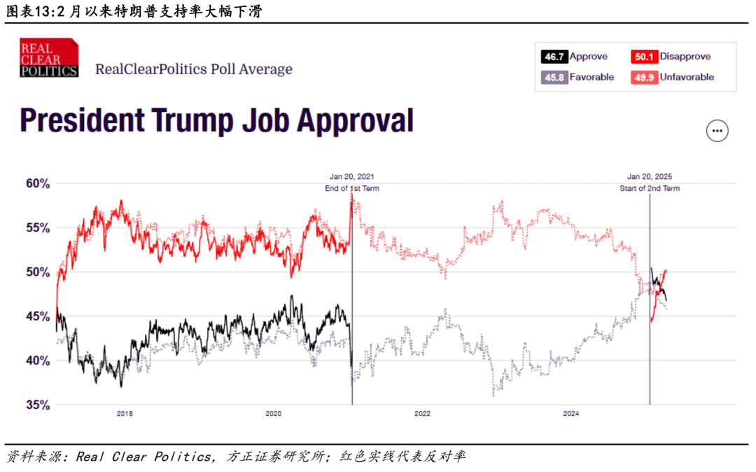 对于市场而言,短期静待Trump Put下关税政策的变化,中长期均衡配置或是较优选择。滞胀压力加大+美股低迷的共振下,2月以来特朗普支持率大幅下滑,Trump Put概率提升,意味着关税政策的变数仍然较大。参考Real Clear Politics汇总的民调数据,2月以来特朗普支持率大幅下滑,意味着其关税政策面临掣肘,尤其是3月后数据层面的滞胀压力将明显加大。同时,白宫对等关税细则对关税政策的调整留有余地,为后续关税谈判打开空间。但从中长期维度,特朗普治下政策不确定性仍然较强,后续或将持续对全球市场带来波动,在此背景下更加均衡配置资产是较优选择。