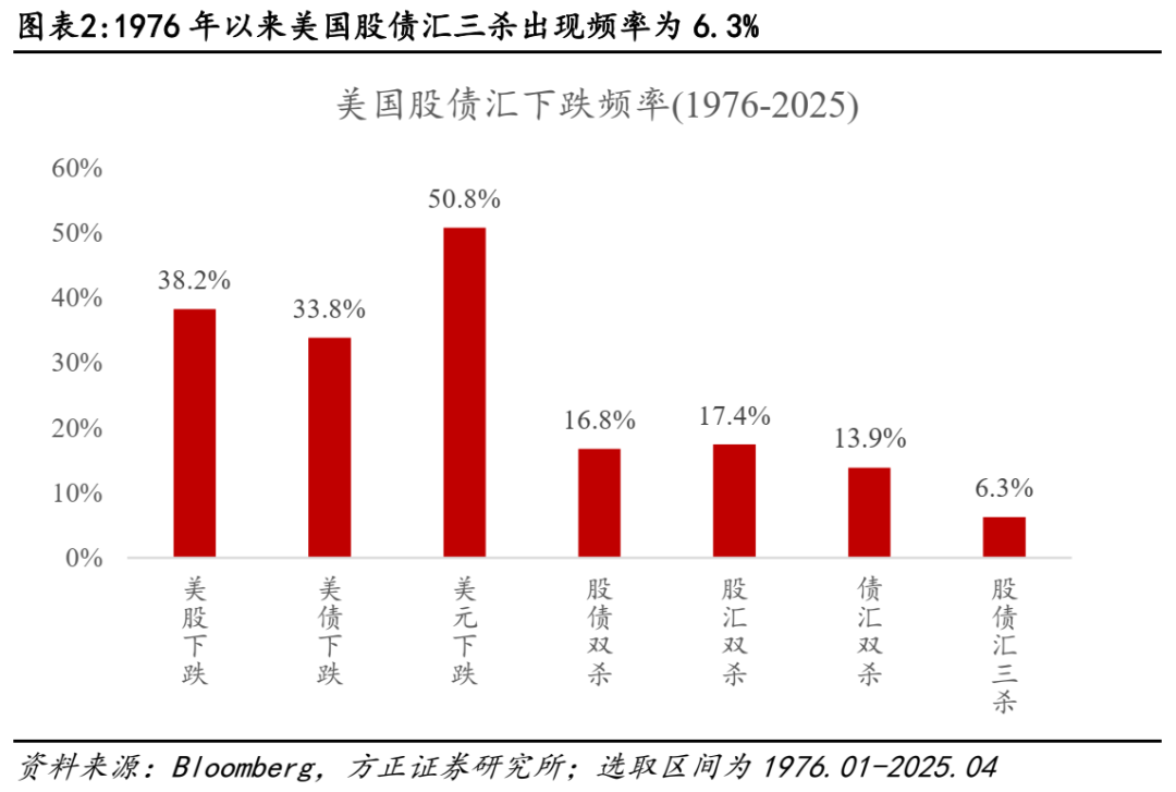 历史经验看,美国“股债汇”三杀较为少见。1976年以来,按月频统计,“股债汇”三杀出现频率为6.3%,是较为少见的场景,尤其考虑到美国是全球最大金融市场,当下“股债汇”三杀引发市场关注。