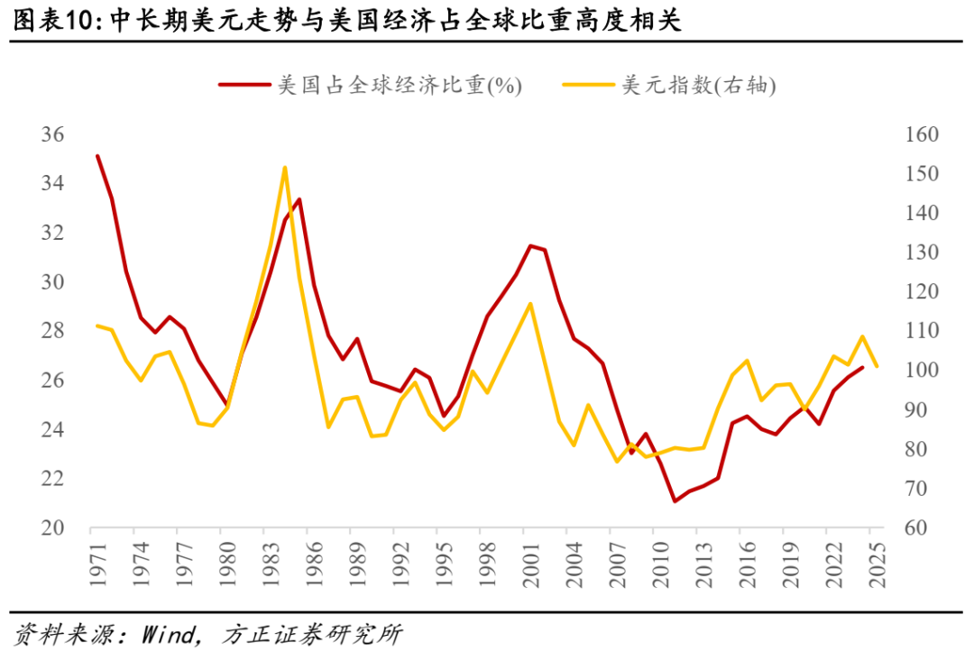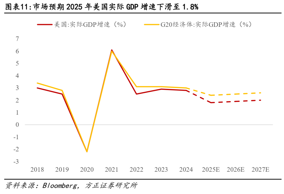 美元的持续回落,首先源于关税冲击下,市场对美国经济下行压力担忧加剧。中长期看,美元走势与美国经济占全球比重高度相关。2011年美国GDP占全球比重降至1960年代以来最低的21.1%,但从2012年开始其比重波动提升,到2024年已上行至26.5%。相应地,美元指数在2012年以来进入明显的上行周期,反映美国经济在全球经济中的地位在加强。但在特朗普关税冲击下,市场对美国经济预期显著下滑,按彭博一致预期,2025年美国实际GDP增速或从2024年的3%下滑至1.8%,而G20经济体增速或从3%降至2.4%,意味着2011年后的美国经济上行周期后续或迎来反转。