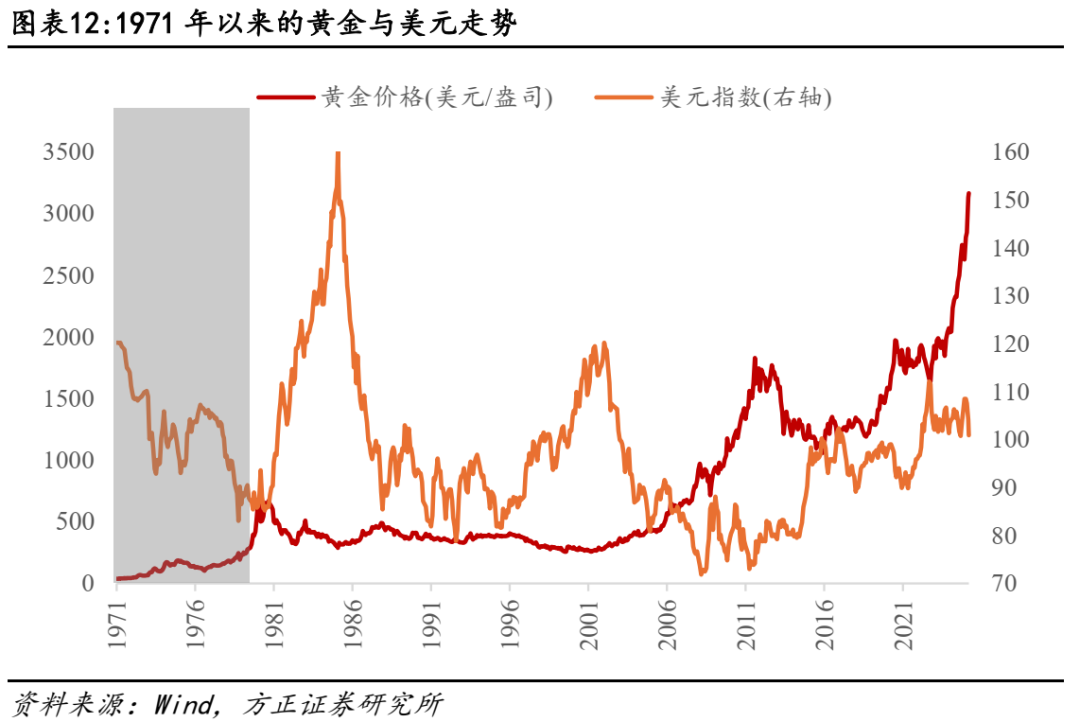 但从更深层次维度看,尤其是结合近期美股、美债走势看,关税冲击下美元信用崩塌风险边际升温,美国资产的吸引力在下降。近期美元指数持续走弱同时,黄金价格持续创新高,美元作为避险资产的属性大幅下降,包括央行在内的投资者选择通过黄金对冲美国风险,表明市场对美元信用产生质疑。而上一轮美元信用面临大幅挑战,是1971年布雷顿森林体系瓦解、美元与黄金脱钩,全球市场进入信用货币阶段,形成1970年代弱美元、强黄金的格局。从短期看,特朗普政策不确定性仍然较强,按现有剧本推演,美国经济出现滞胀的概率大幅提升,意味着美国资产不确定性较高。另一方面,其政策经常自相矛盾,尤其是通过加关税实现缩小贸易逆差、制造业回流的政策主张,与美元的储备货币地位存在天然冲突。在此背景下,美股、美债、美元等美国资产抛售压力加大。