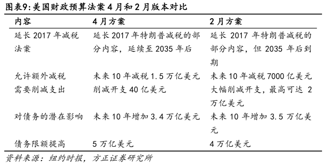 新财政预算或大幅增加美国政府债务,美债供给端压力提升。 4月10日,美国众议院以微弱优势通过了共和党削减税收和政府支出的预算蓝图,推动减税和债务限额提高,但削减支出幅度有限,或大幅度提高后续美国政府债务:(1)延长2017年减税法案:与2月方案相比,4月预算方案将减税延续至2035年后;(2)允许额外减税:与2月相比,未来10年额外减税金额从7000亿美元提升至1.5万亿美元;(3)削减支出:2月方案提出削减开支最高可达2万亿美元,4月份参议院版本的预算框架仅提出削减支出约40亿美元,而众议院版本则寻求至少削减1.5万亿美元的支出,但最终两院达成统一方案,初步削减开支40亿美元;(4)债务限额提高:将联邦政府的债务上限从4万亿美元提升至5万亿美元;(5)对债务的潜在影响:未来10年或增加3.4万亿美元。