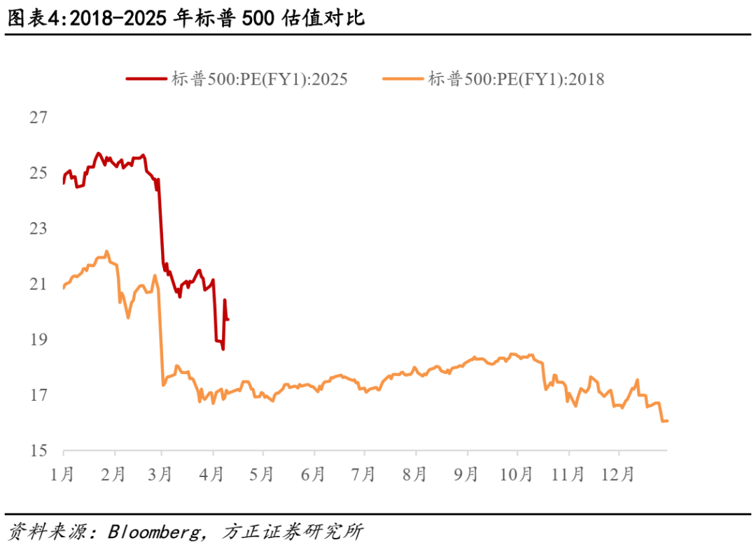 美股估值端大幅下行,但短期修复可持续性仍存疑,仍需观察后续关税政策动向。本轮美股杀估值,是从2月中旬的最高值25.7X降至4月8日的18.6X,到4月11日边际反弹至19.7X,累计降幅-23.1%。而参考2018年贸易战,当年度美股估值波动下行,到2018年底降至15.9X,累计降幅-28.5%。本轮加关税覆盖对象更广且经济影响更大,目前看不确定性仍然较强,估值端修复的短期能见度仍相对较弱。