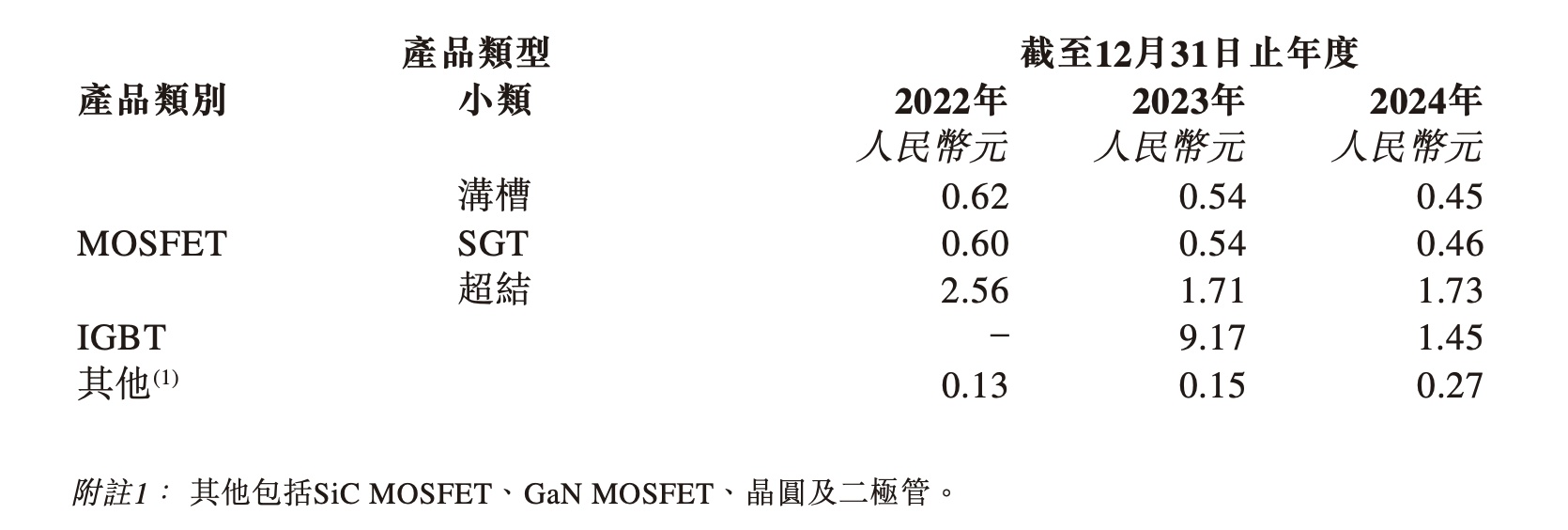 公司于招股书中坦言,报告期内,公司沟槽MOSFET及SGT MOSFET的平均售价呈下降趋势。其中,沟槽 MOSFET的平均售价由2022财年的每件约0.62元降至2024年的每件约0.45 元,而SGT MOSFET的平均售价则由2022年的每件约0.60元降至2024年的每件约0.46元。该跌幅主要是由于2022年底产能提升及市场需求减弱导致存货过剩,令原材料价格普遍下跌,导致2023年价格下跌。而2024年,则因为原材料价格下跌,导致沟槽MOSFET及SGT MOSFET的平均售价均下跌。