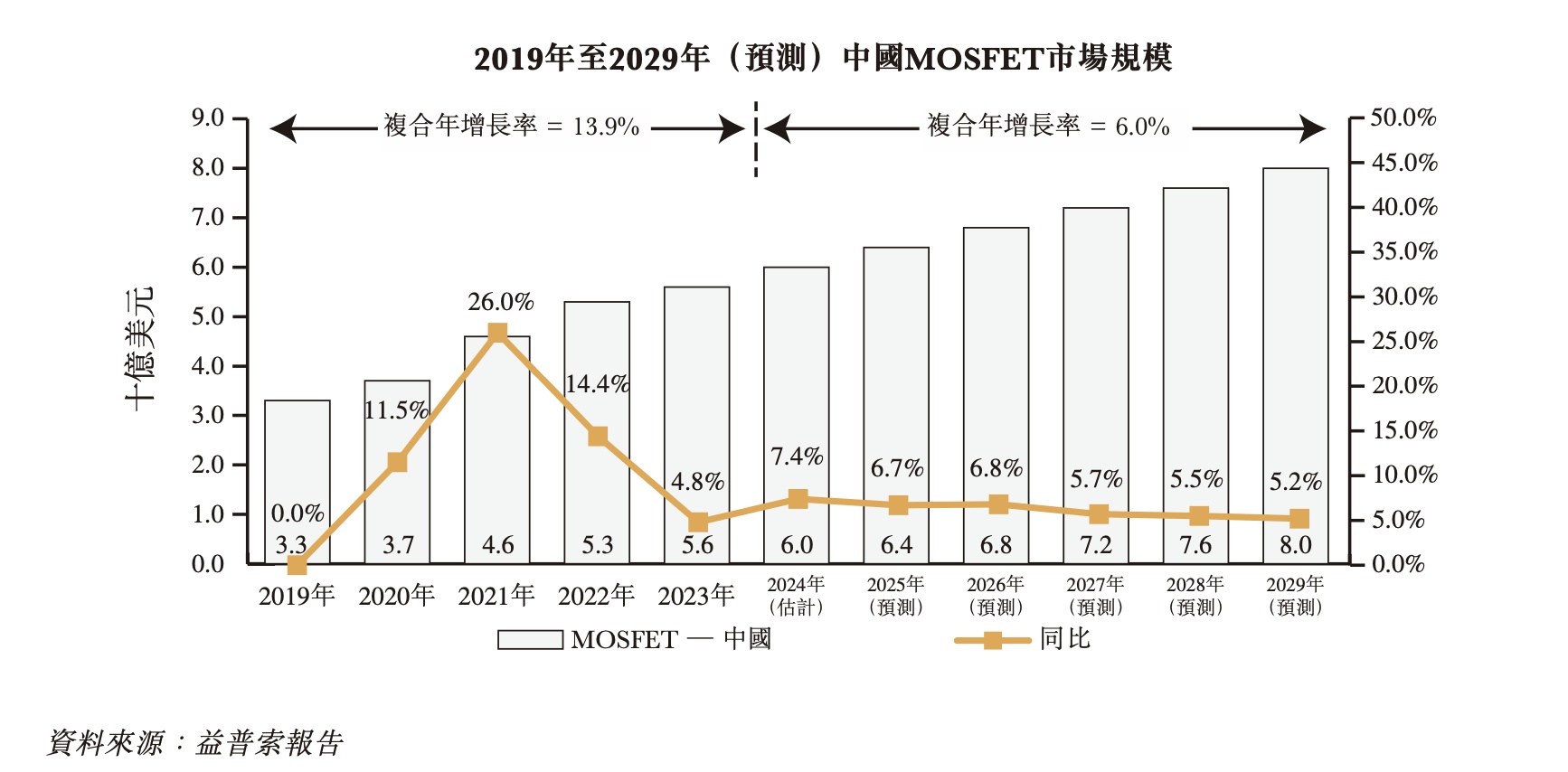 随着更多行业因其在电源管理方面的优异性能而采用MOSFET,其用途预计将继续扩大。但经历前几年的快速增长后,中国MOSFET市场正在过渡至一个更成熟的阶段,随着竞争加剧及市场饱和,预计未来数年市场增长率将放缓。预计中国MOSFET市场的总市场规模将由2024年的60亿美元增至2029年的80亿美元,复合年增长率约为6.0%。