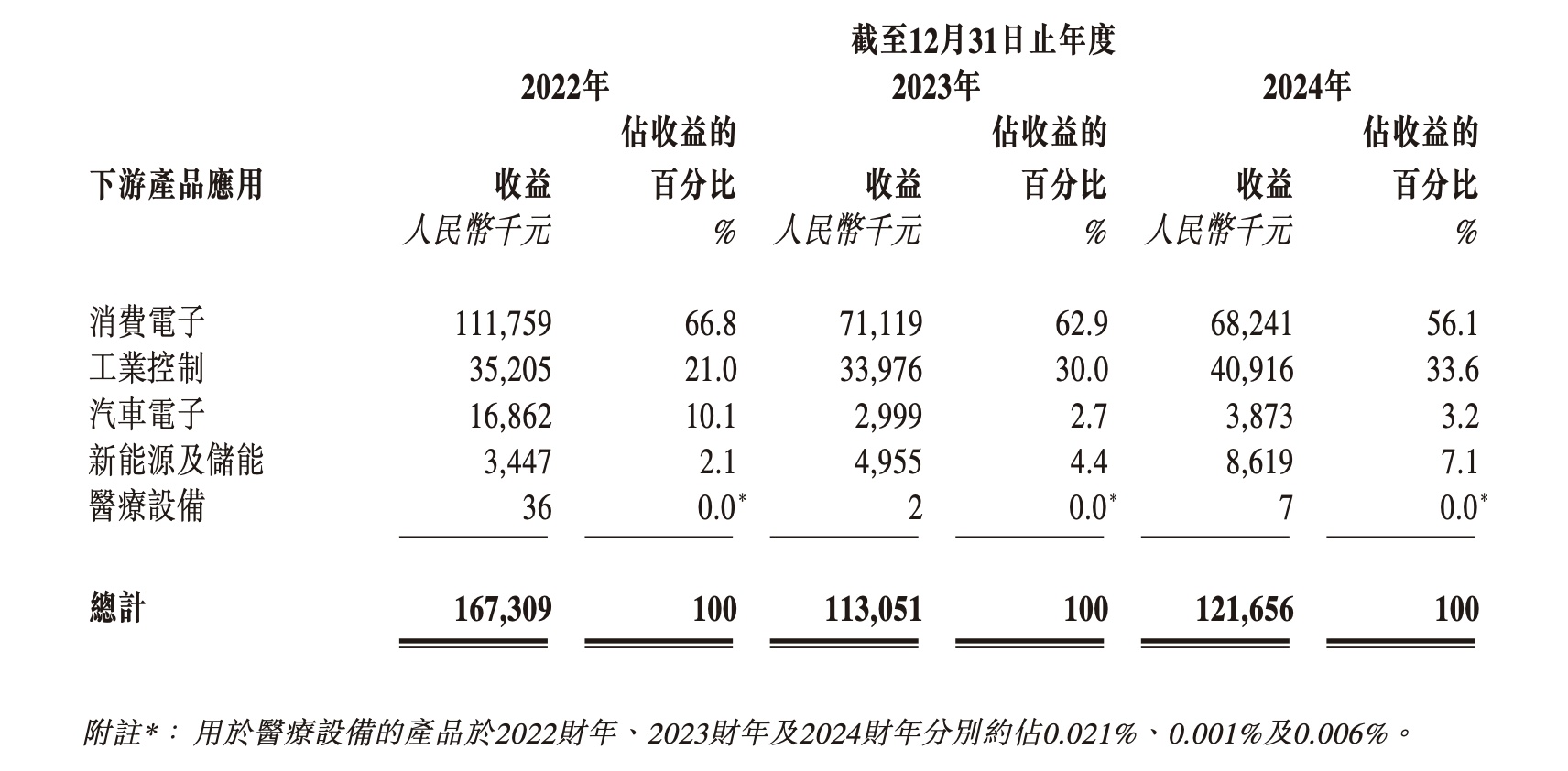 在以上两大业务营收占比增长的同时,来自消费电子行业的营收却大幅下滑。据了解,公司超半数以上的客户均来自于消费电子行业,但或许受到近年來全球消费电子行业需求疲软的影响,公司来自消费电子行业的营收持续下滑,由2022年的1.12亿元下滑至2024年的6824.1万元,业务收入占比也从66.8%下滑至56.1%。