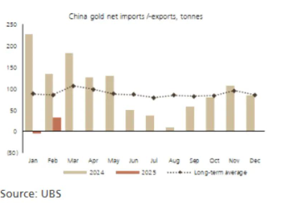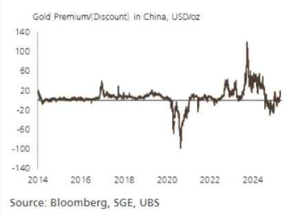 智通财经APP获悉,瑞银发布研究报告称,结束一年一度的中国贵金属行业考察之旅归来,对黄金市场更加看好。上周五,金价再创新高,瑞银将2025年黄金目标价上调至每盎司3500美元。上海黄金交易所黄金溢价较伦敦本地金价大幅扩大至每盎司40美元。黄金ETF及人民币贬值背景下的小克重投资金条需求强劲;而珠宝消费因价格高企同比下降24%,但高端工艺产品逆势回升。市场普遍乐观预期进口配额即将释放以缓解库存压力。