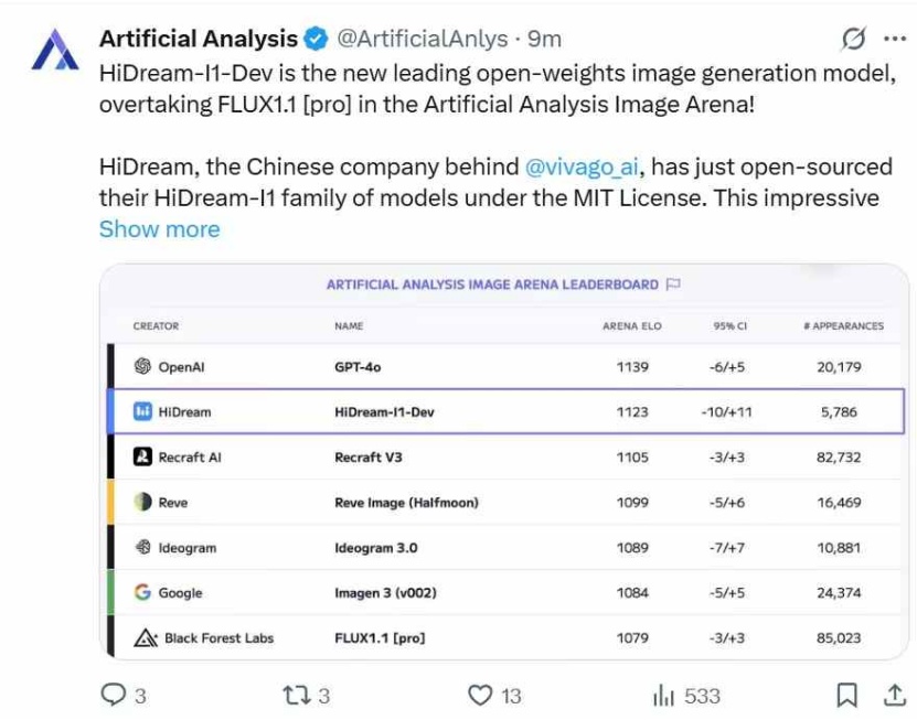 智通财经APP获悉,近日,本土科技公司智象未来开源图片生成模型HiDream-I1,其在上线的24小时内登顶全球领先的独立 AI 基准测试与分析平台Artificial Analysis竞技场榜单,也是首个登顶该榜单的国产自研生成式AI模型。
