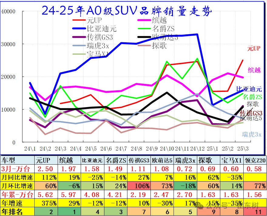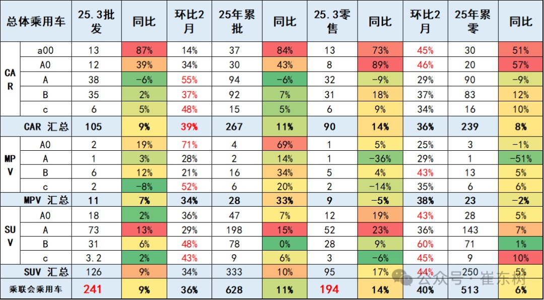 A0级SUV 2025年3月批发18.35万台,占批发份额14.6%,批发较去年同期同比增长2%,批发环比今年上月增长36%;2025年3月零售较去年同期同比增长19%,零售环比今年上月增长43%。2025年1-3月批发数量47.11万台,厂家批发销售累计增幅7%;2025年1-3月国内零售数量27.56万台,零售累计增幅5%。