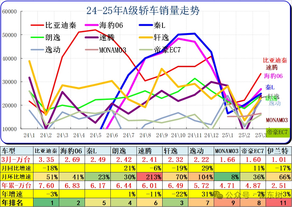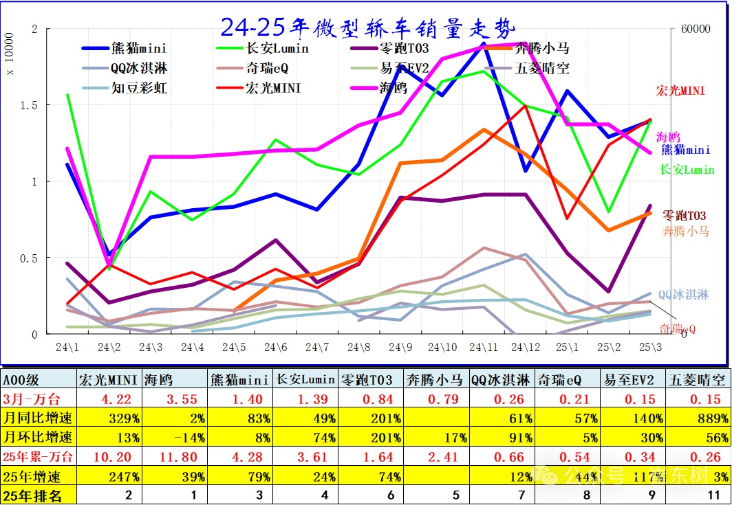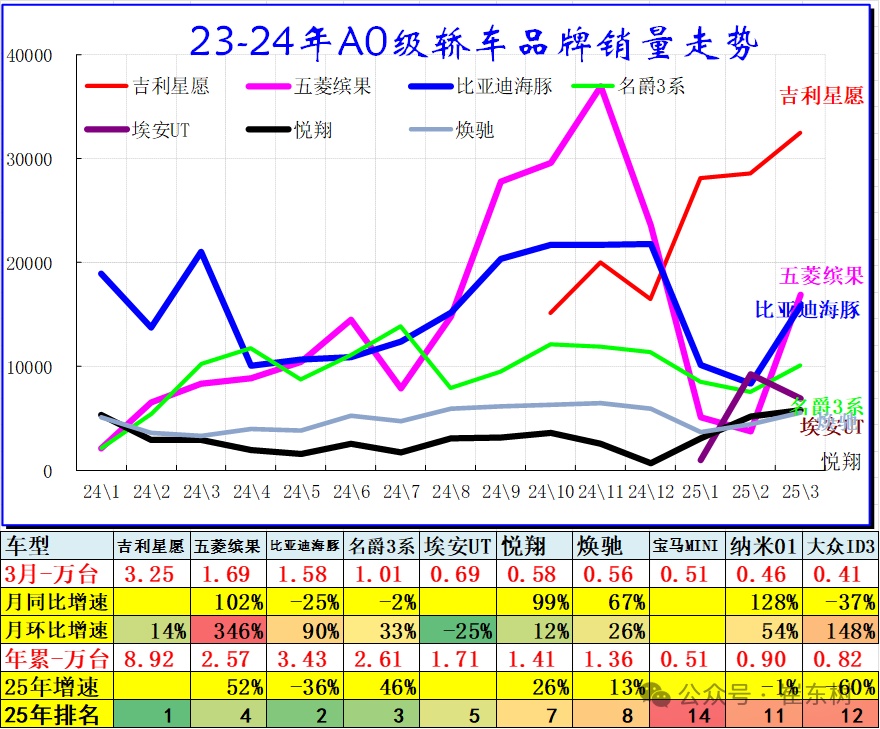 A0级轿车2025年3月批发12.37万台,占批发份额11.82%,批发较去年同期同比增长39%,批发环比今年上月增长34%;2025年3月零售较去年同期同比增长89%,零售环比今年上月增长46%。2025年1-3月批发数量29.52万台,厂家批发销售累计增幅43%;2025年1-3月国内零售数量19.5万台,零售累计增幅57%。