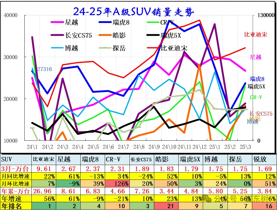 A级SUV 2025年3月批发73.17万台,占批发份额58.19%,批发较去年同期同比增长13%,批发环比今年上月增长29%;2025年3月零售较去年同期同比增长23%,零售环比今年上月增长36%。2025年1-3月批发数量198.32万台,厂家批发销售累计增幅15%;2025年1-3月国内零售数量143.07万台,零售累计增幅7%。