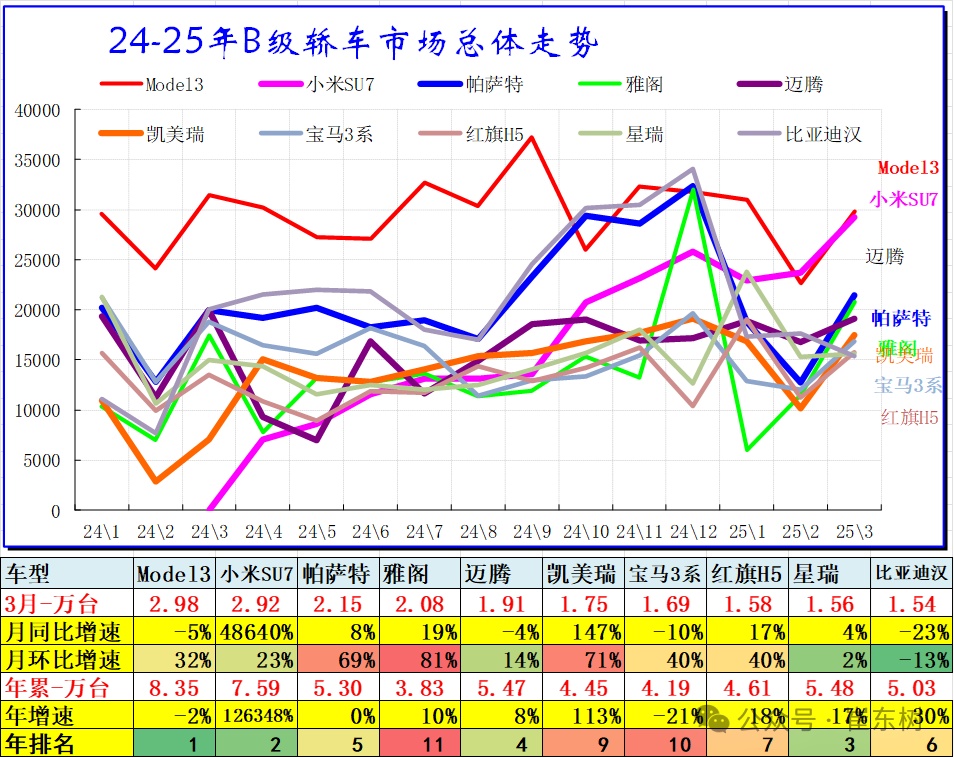 B级轿车2025年3月批发35.06万台,占批发份额33.51%,批发较去年同期同比增长2%,批发环比今年上月增长37%;2025年3月零售较去年同期同比增长18%,零售环比今年上月增长37%。2025年1-3月批发数量91.73万台,厂家批发销售累计增幅7%;2025年1-3月国内零售数量83.37万台,零售累计增幅12%。