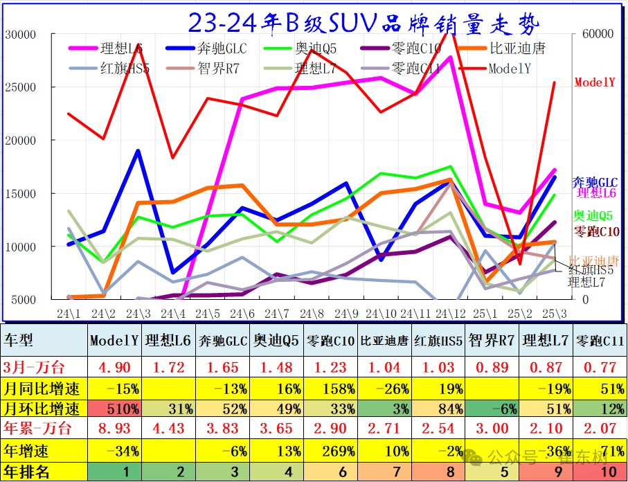 B级SUV 2025年3月批发30.7万台,占批发份额24.42%,批发较去年同期同比增长6%,批发环比今年上月增长48%;2025年3月零售较去年同期同比增长9%,零售环比今年上月增长60%。2025年1-3月批发数量78.29万台,厂家批发销售累计增幅持平;2025年1-3月国内零售数量70.51万台,零售累计增幅1%。