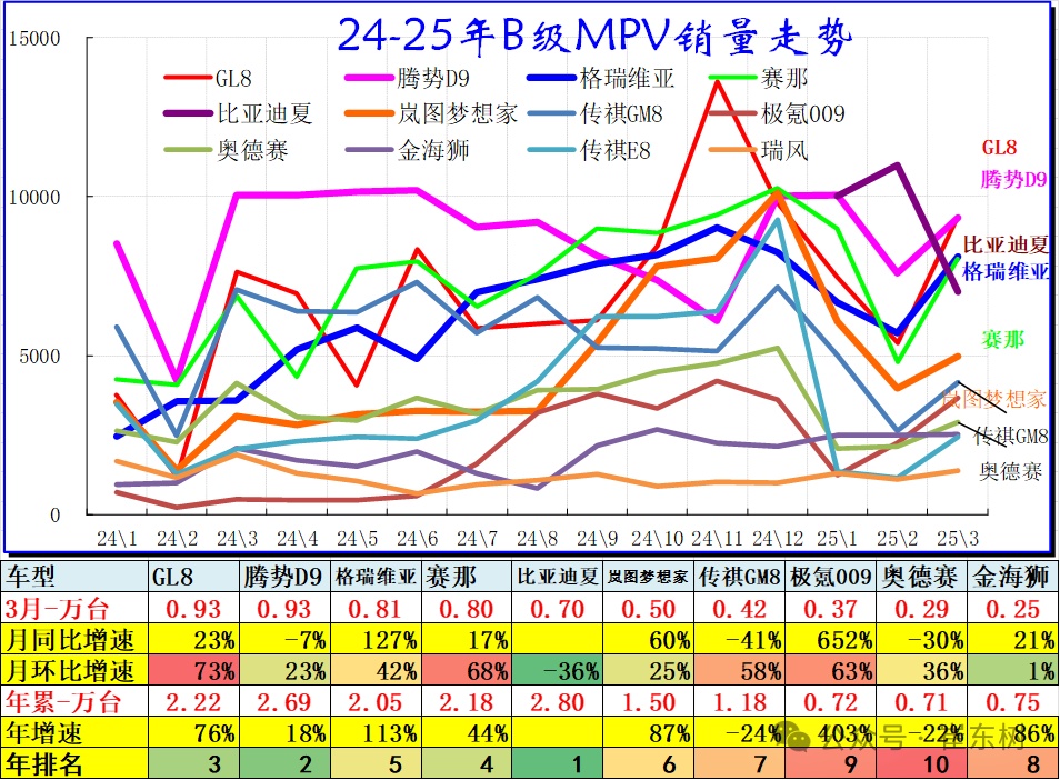 MPV市场的高增长阶段已经改为低增长趋势。腾势和传祺的MPV表现超强,日系的MPV优势迅速下降,GL8也处于调整期。