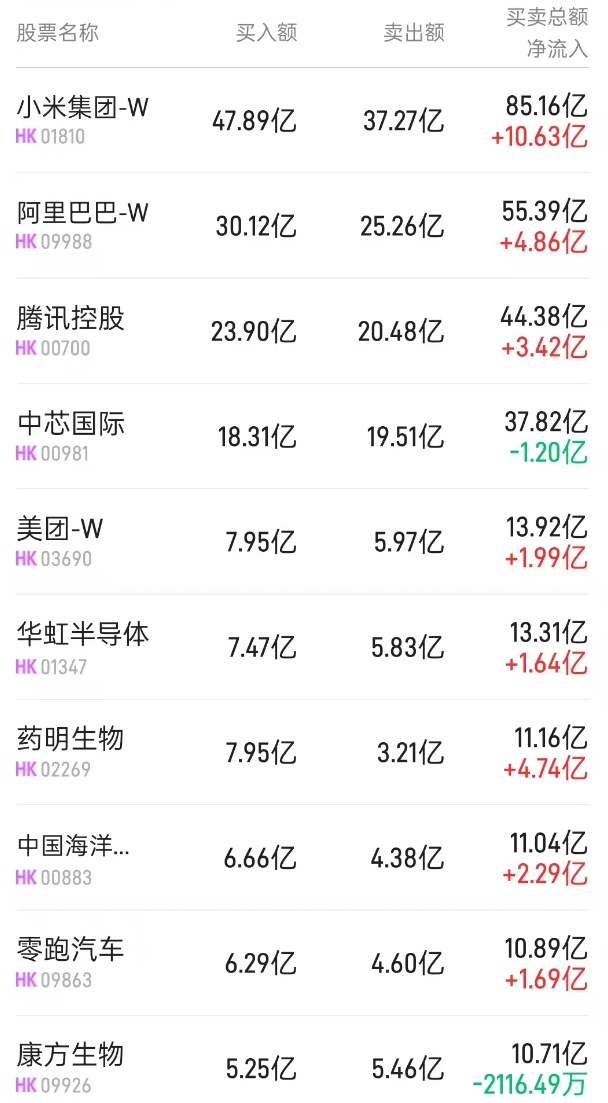 此外,小米集团-W(01810)、零跑汽车(09863)分别获净买入1.78亿、1.68亿港元。
