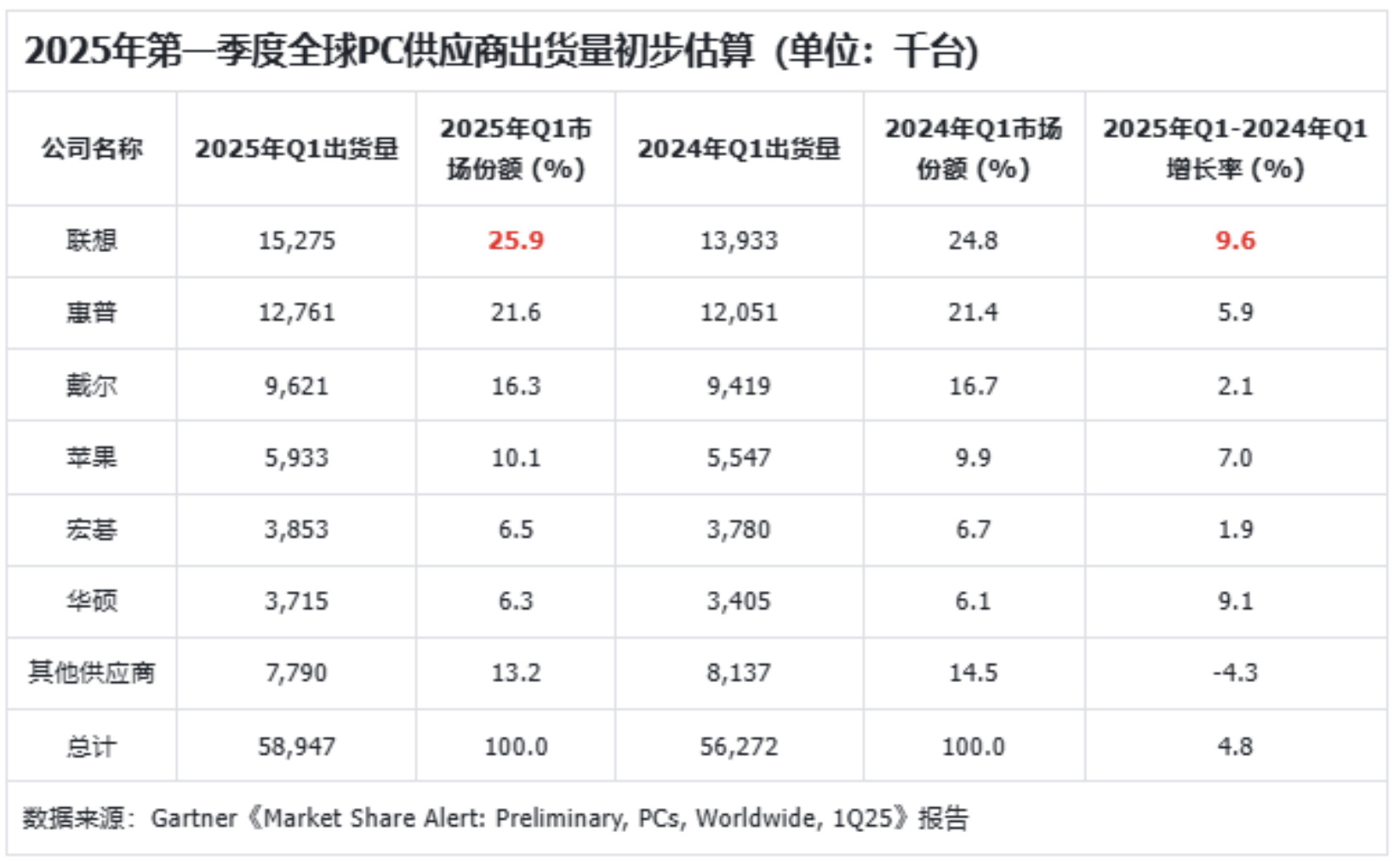 在2025年第一季度,联想以1527.5万台的出货量稳居全球PC市场首位,市场份额从去年同期的24.8%提升至25.9%。这一增速不仅远超行业平均水平,也在全球前六大供应商中排名第一,展现了联想在全球PC市场的强劲竞争力。