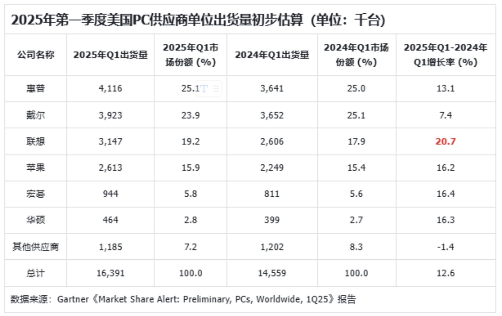 在美国市场,联想同样表现强劲。2025年第一季度,联想在美国的PC出货量达到314.7万台,同比增长20.7%,市场份额从去年同期的17.9%提升至19.2%。这一增速在所有供应商中排名第一,进一步巩固了联想在美国市场的领先地位。