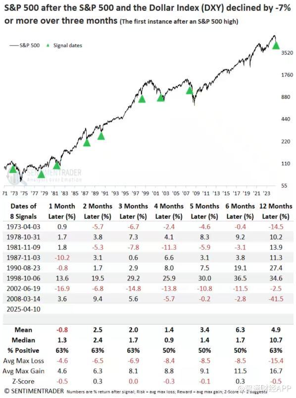SentimenTrader对历史上类似情形进行了复盘研究:他们筛选出自1973年以来美元与标普500在三个月内双双下跌7%以上的八次情形。虽然这项研究更倾向于提供市场参考而非明确交易信号,其中仍透露出一些有价值的规律:美元在6个月内的表现并无规律,基本如同“抛硬币”;但在一年之后,75% 的情况中美元上涨;标普500则常见“先涨后跌”:通常会在接下来的三个月里小幅反弹,但随后动能减弱,在第4至第6个月期间仅有一半的情形中继续上涨;更值得注意的是,有6次标普500在之后创下更低的低点,也就是说,市场真正的底部还在更后面。而仅1978年与1998年两次例外,在触底后反弹走高。