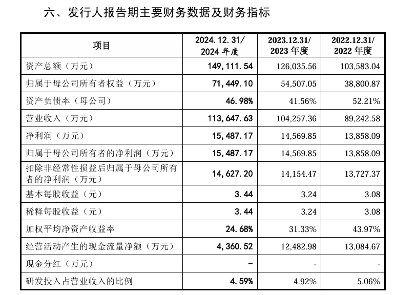 财务方面,于 2022年度、2023年度及2024年度,公司实现营业收入分别约为8.92亿元、10.43亿元、11.36亿元;公司净利润分别约为1.39亿元、1.46亿元以及1.55亿元人民币。