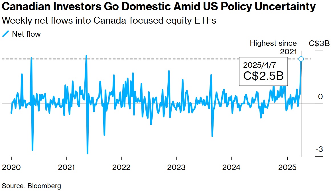 数据显示,4月7日至11日期间,主要持有加拿大股票的ETF净流入25亿加元(18亿美元),创2021年5月以来最大单周流入。这一激增出现在美国总统特朗普4月2日宣布对185个国家和地区实施所谓对等关税之后。