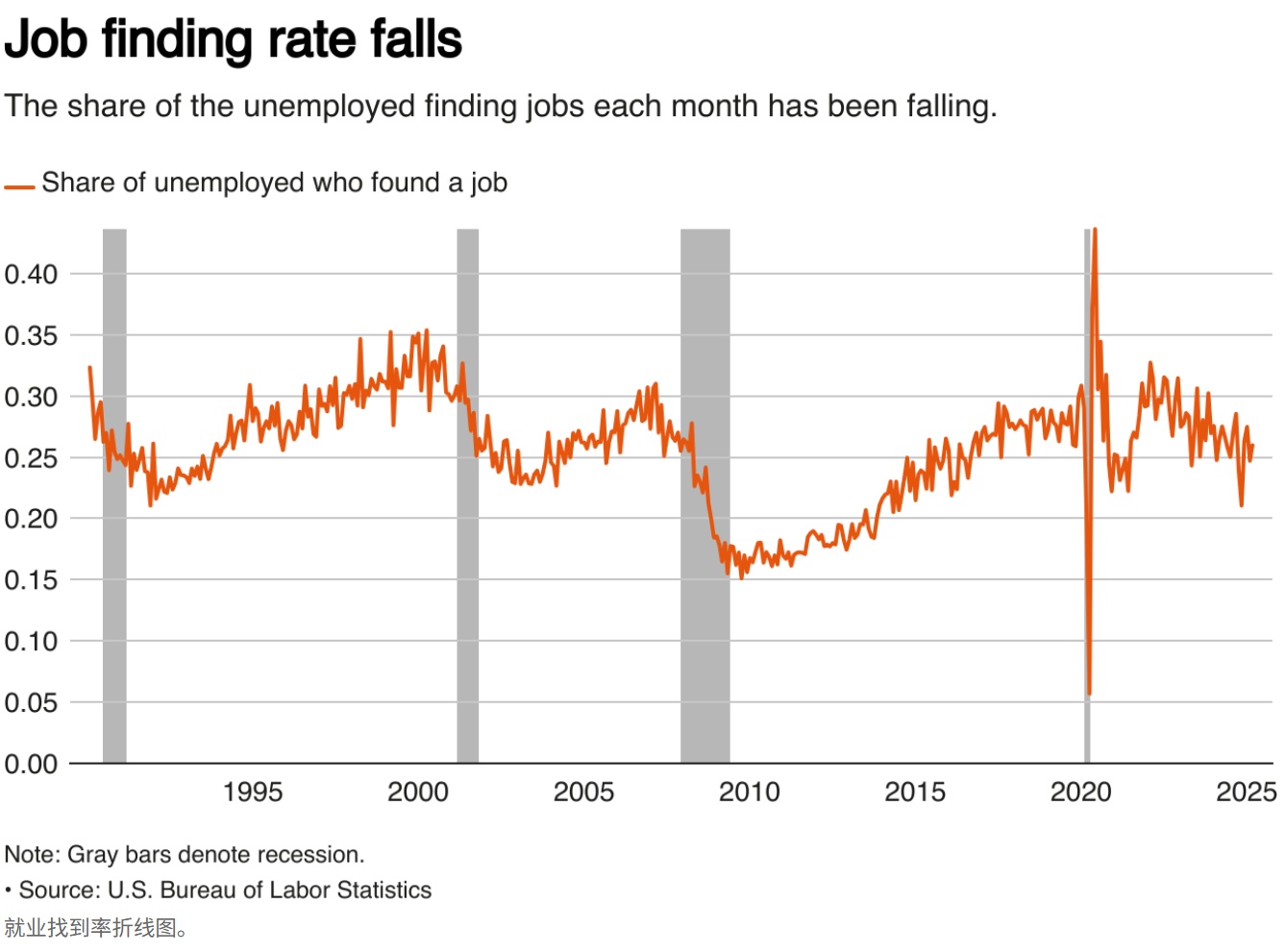 但该报告指出,衡量失业人群每月成功就业比例的指标自2023年中期以来持续下滑,这一趋势与历次经济衰退前的轨迹高度相似。