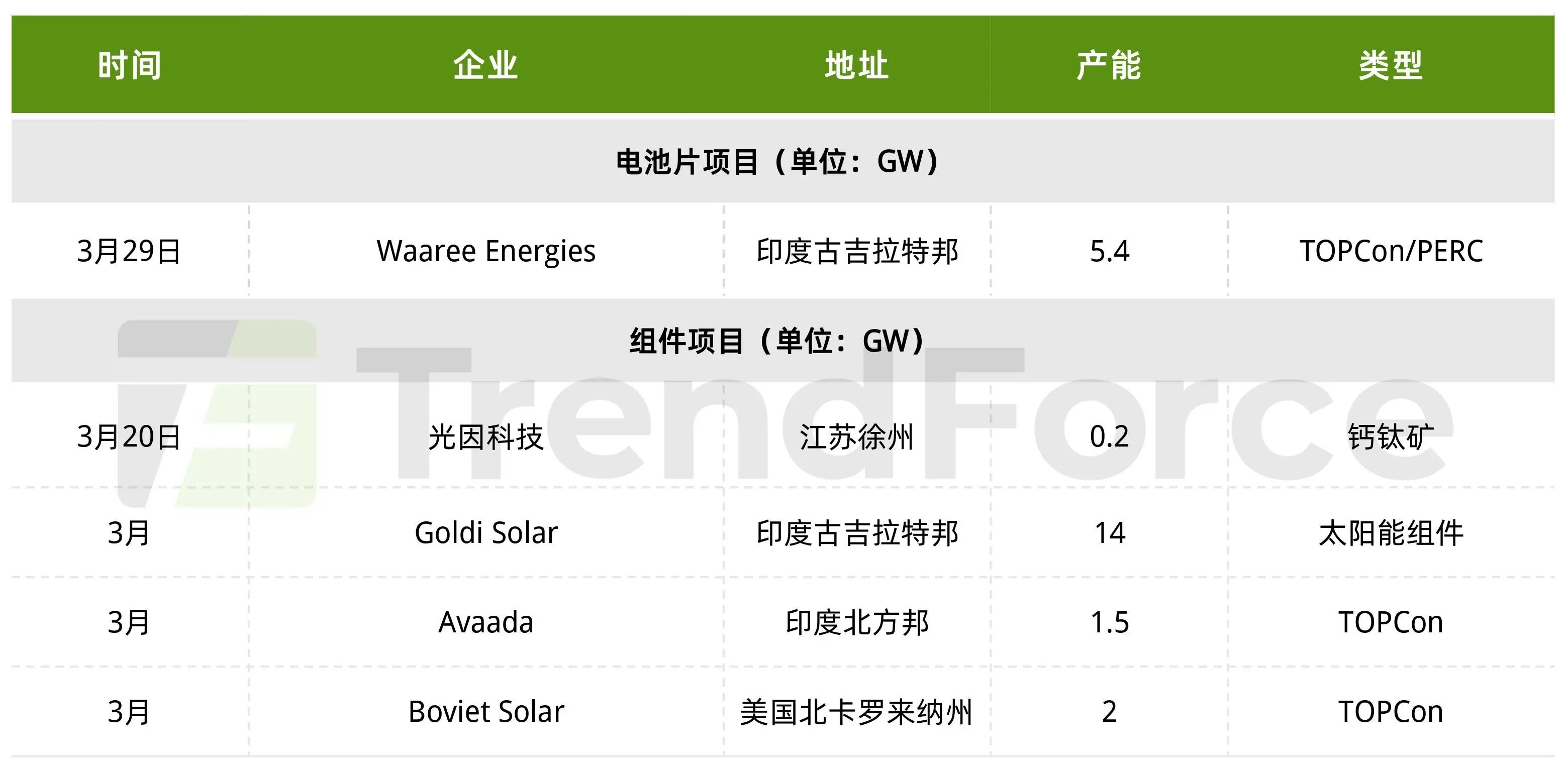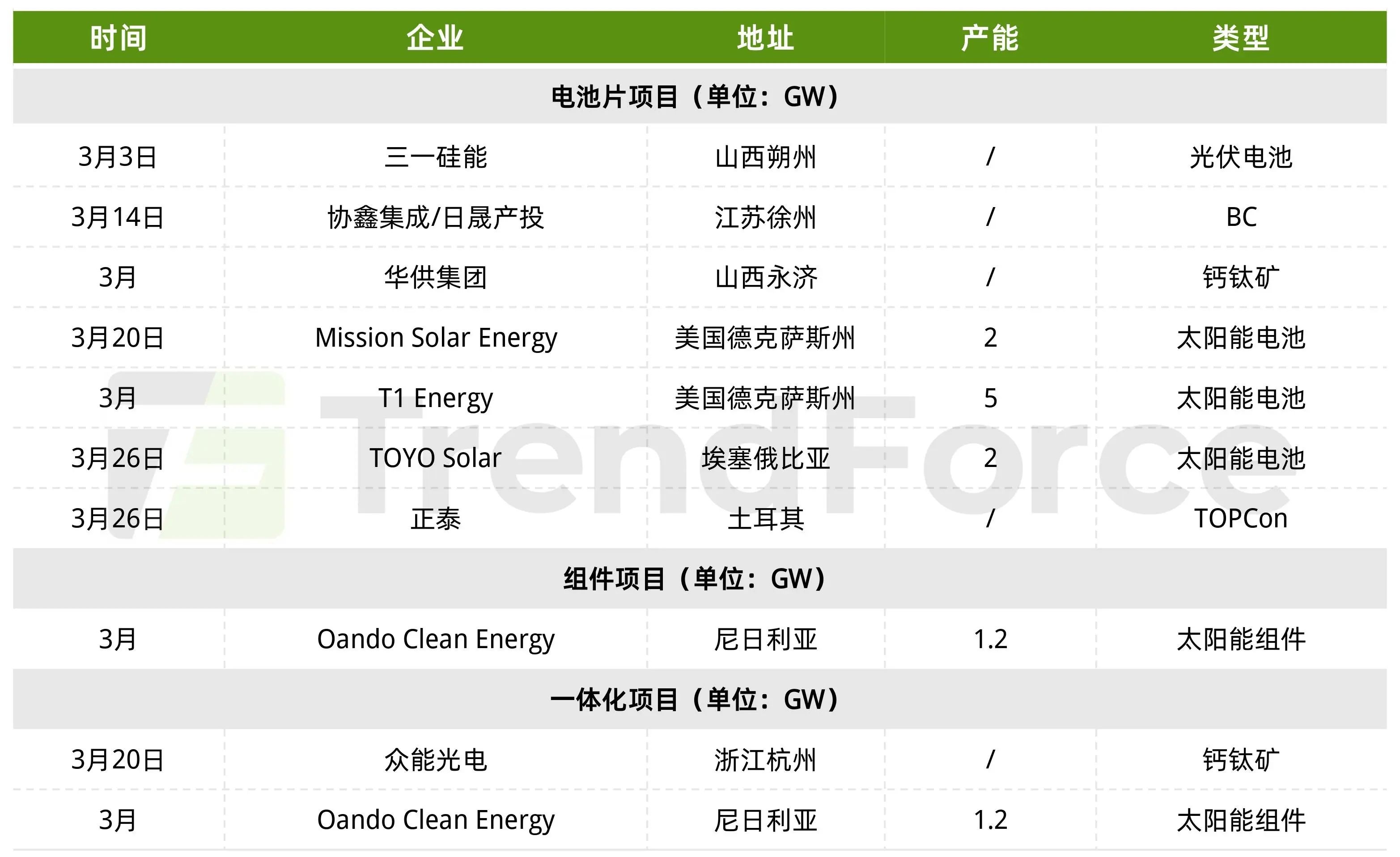 据TrendForce集邦咨询不完全统计,2025年3月光伏投产项目有5个,国内投产项目规模0.2GW,海外投产项目规模22.9GW。从具体环节来看,电池片环节投产规模5.4GW,组件环节投产规模17.7GW。
