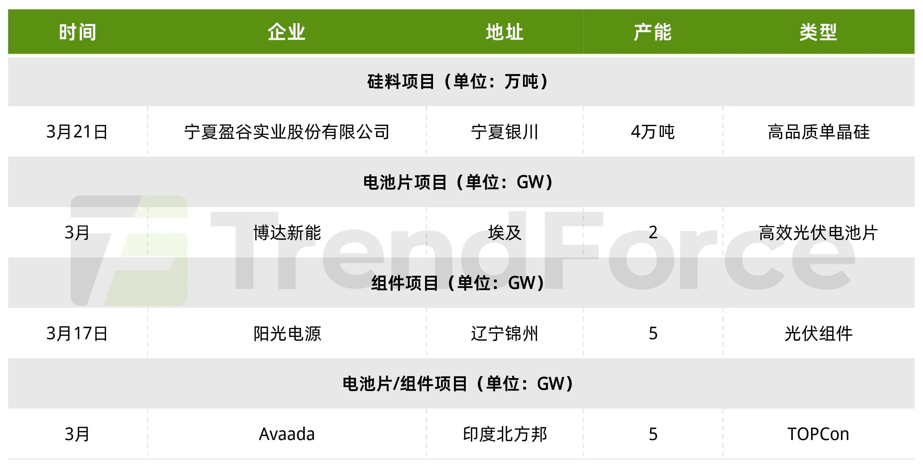 智通财经APP获悉,集邦咨询发文称,2025年3月,在政策窗口期临近催生的抢装需求、行业自律减产以及供需格局持续优化等多重因素推动下,光伏产业链价格整体呈现上涨趋势。3月国内光伏项目签约、开工、投产节奏较前期有所放缓,但值得注意的是,多个项目已进入投产倒计时阶段。海外市场方面,扩产项目在数量和规模上均有所收缩,然区域布局更趋多元化,开工、投产规模显著增长,且集中于印度市场。