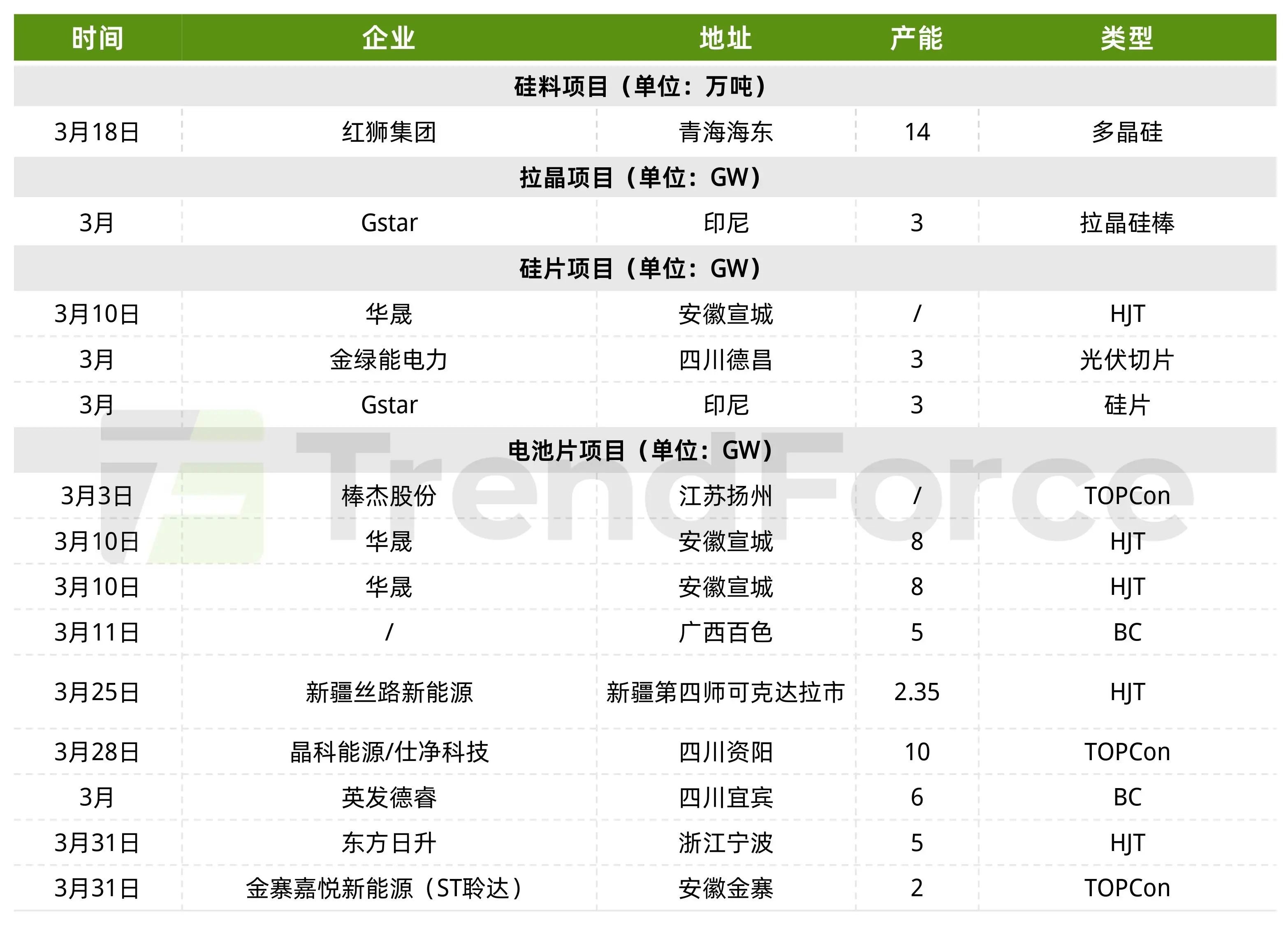 硅料环节:3月18日,红狮集团表示海东红狮硅基新材料项目一期年产14万吨多晶硅项目已进入试生产阶段。