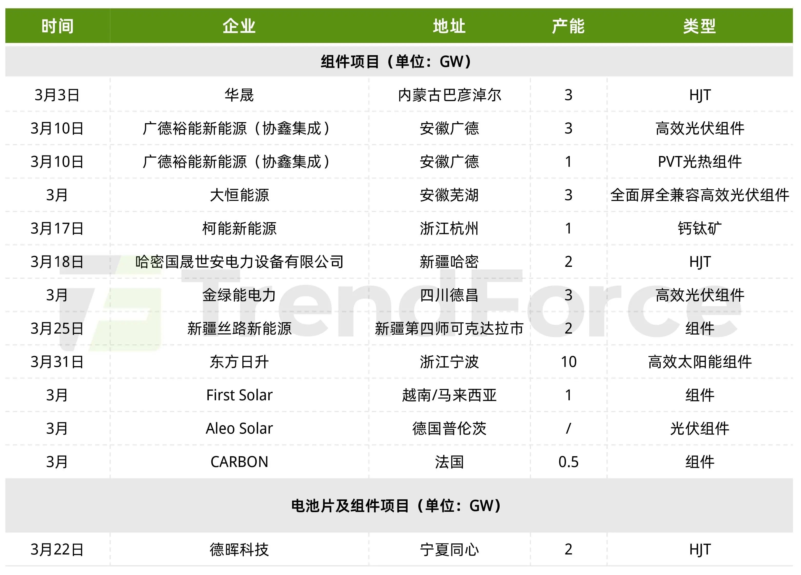 组件环节:3月,内蒙古华晟年产3GW高效光伏组件建设项目、广德裕能新能源年产3GW莲花系列高效光伏组件及1GWPVT光热组件项目环评受理公示。大恒能源南陵3GW全面屏全兼容高效光伏组件研发制造项目即将竣工投产。3月17日,柯能新能源为1GW高效钙钛矿太阳能电池组件项目募资。3月18日,哈密国晟世安电力设备有限公司2GW高效异质结太阳能组件生产项目环评获批。金绿能电力年产3GW光伏切片、3GW高效光伏组件项目目前已完成组件车间主结构建设,即将投产。